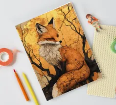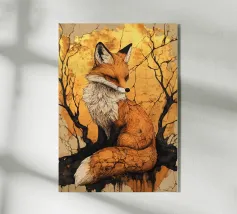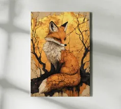 In questo dipinto espressivo, una volpe calma e di colore marrone rossiccio siede su uno sfondo di rami dorati e texture screpolate. La composizione combina l'eleganza dell'animale con una tavolozza di colori caldi e autunnali e una profondità artistica. Ideale per gli amanti della natura, della foresta e dell'arte che apprezzano gli animali in pose calme e riflessive. Questo motivo è perfetto per salotti accoglienti, uffici o spazi di lavoro creativi. Parla di tranquillità, intuizione e della bellezza di ritirarsi nella natura.