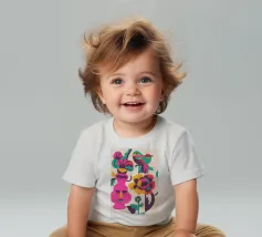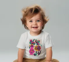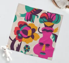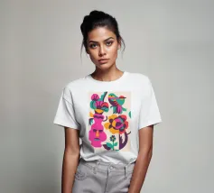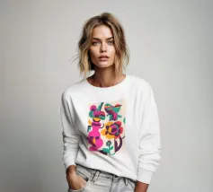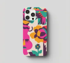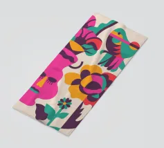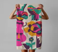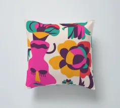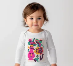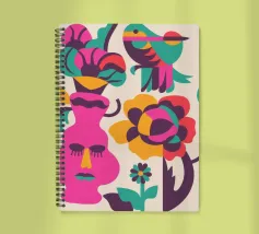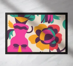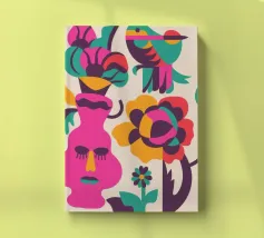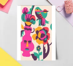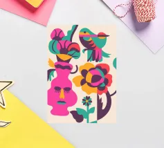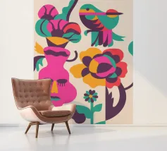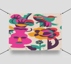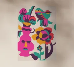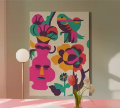 Una composizione astratta con un volto rosa con gli occhi chiusi, circondato da fiori e uccelli colorati. Gli elementi sono disposti in modo stravagante e surreale.