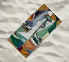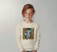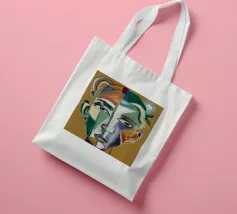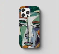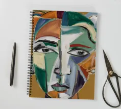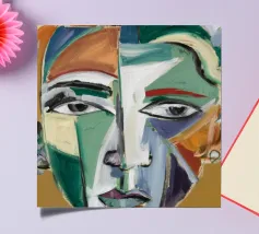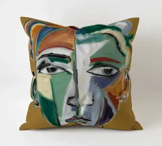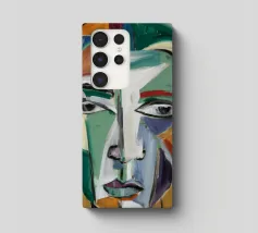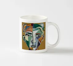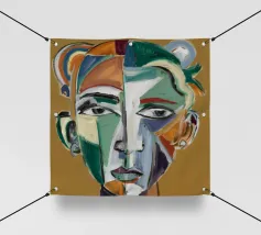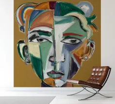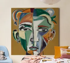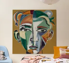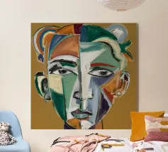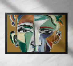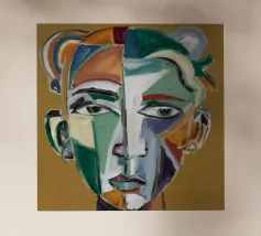 Questo dipinto presenta un volto dai molteplici colori e forme. Lo sfondo è un mix di arancione e verde acqua, che crea un effetto vibrante e dinamico.