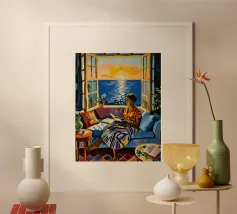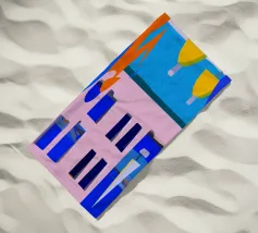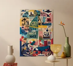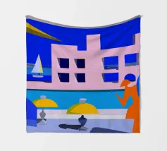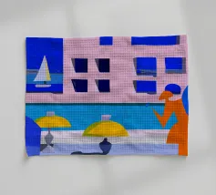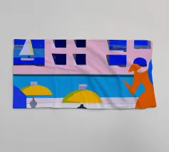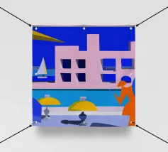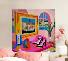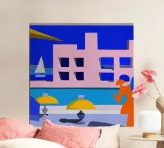 Da una terrazza stilizzata, il mare si estende a perdita d'occhio. Un edificio rosa riflette la luce del sud, una barca a vela scivola lentamente sull'acqua azzurra, mentre sagome colorate si godono la morbidezza del giorno. In questa composizione pura e vibrante, l'artista francese cattura l'essenza della Costa Azzurra: il calore, la geometria della calma, la luce chiara che trasforma tutto in poesia visiva. Le audaci tonalità piatte del blu, del rosa e dell'arancione creano un equilibrio tra astrazione e narrazione: una moderna vista sul mare, dove la semplicità diventa lusso.