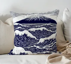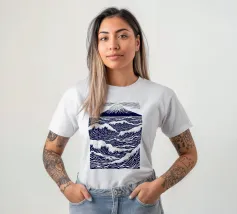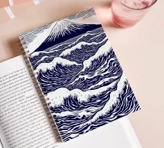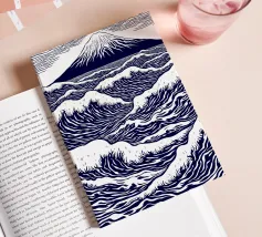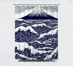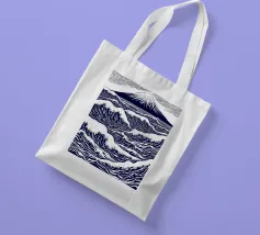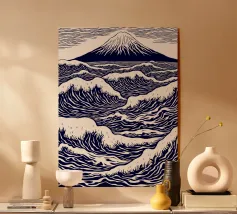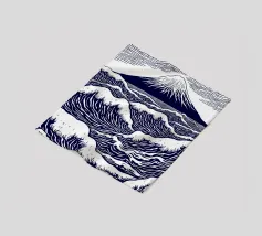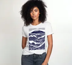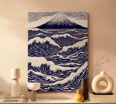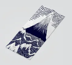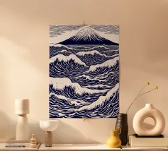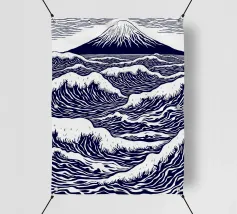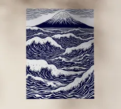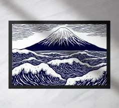 Questa illustrazione in stile linoleografico raffigura un drammatico paesaggio marino con onde potenti e ondeggianti in primo piano e una maestosa montagna innevata sullo sfondo. L'audace contrasto tra bianco e nero e l'intricato lavoro al tratto creano una composizione dinamica e strutturata. Lo stile ricorda le tradizionali stampe giapponesi su blocco di legno.