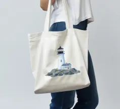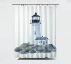 Un classico faro bianco si erge maestoso sulle rocce frastagliate della costa del Maine. La scena trasmette l'aspra bellezza del paesaggio costiero nordamericano, unita all'orientamento, alla sicurezza e alla tradizione marittima.