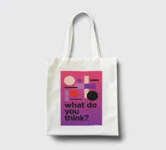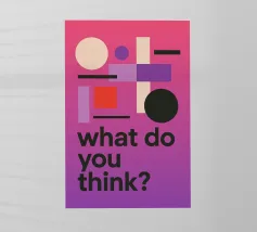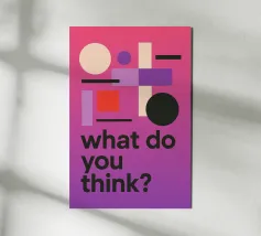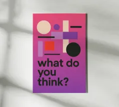 Questo moderno poster in stile Bauhaus combina forme geometriche chiare con un vibrante gradiente di colori dal rosa intenso al viola profondo. La scritta "What do you think?" in caratteri chiari e neri invita a riflettere. Perfetto per spazi creativi, soggiorni eleganti o uffici minimalisti.