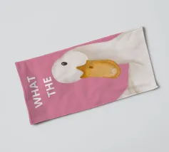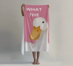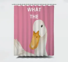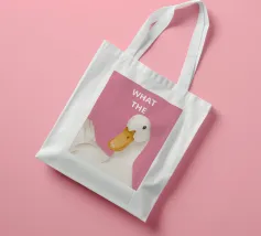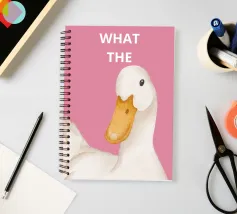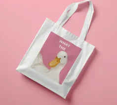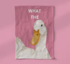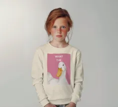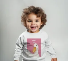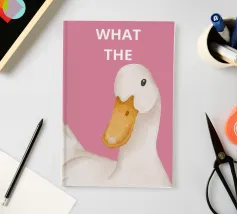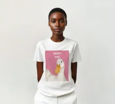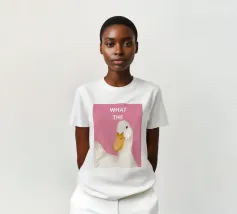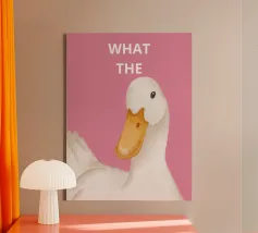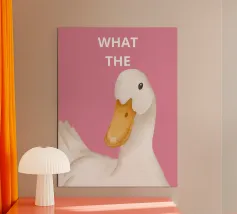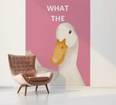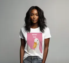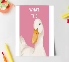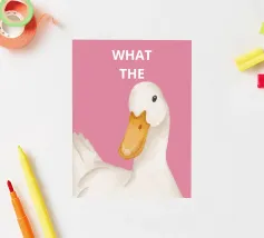 Un'anatra stravagante dall'espressione curiosa è centrata su uno sfondo rosa. Sopra l'anatra, un testo bianco in grassetto recita "WHAT THE".