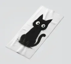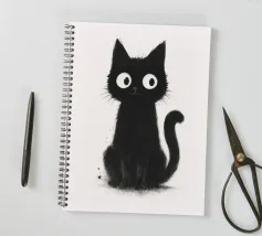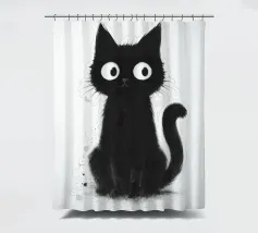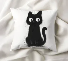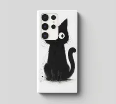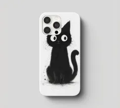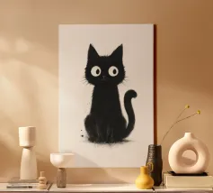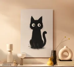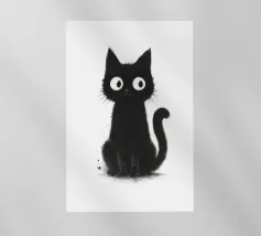Un piccolo gattino nero siede in posizione eretta con una postura vigile e curiosa, i suoi occhi bianchi sovradimensionati gli conferiscono un'espressione luminosa e accattivante. La pelliccia è resa con texture morbide e color inchiostro e sottili dettagli splatter, creando un fascino dipinto a mano e leggermente disordinato. La coda si arriccia delicatamente di lato e lo sfondo bianco e pulito fa risaltare la silhouette scura e i tratti espressivi con una chiarezza semplice e stravagante.