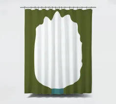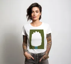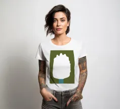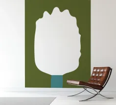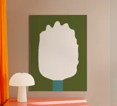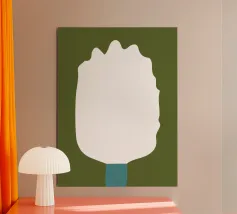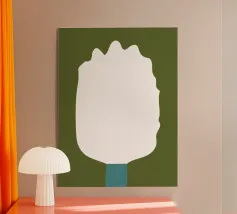 Il design minimalista è caratterizzato da una forma stilizzata di albero bianco con una base verde acqua. La forma astratta spicca e cattura l'attenzione con la sua semplicità e i suoi colori contrastanti.