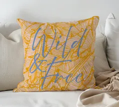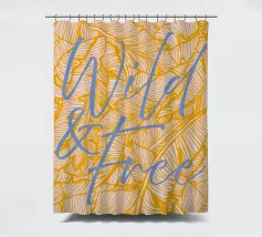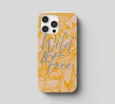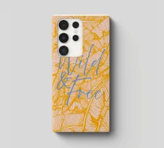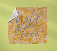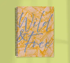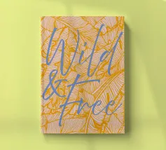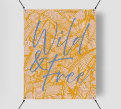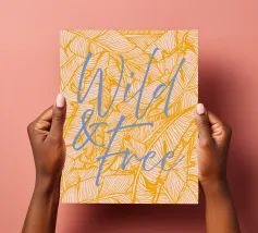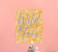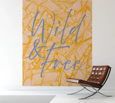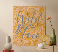 Citazione scritta a mano semplicemente "Wild & Free" su sfondo vivace di foglie tropicali
