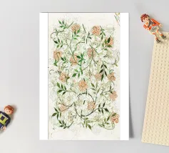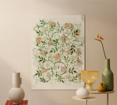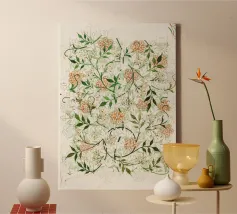 Un disegno floreale delicato e senza tempo di William Morris (1834-1896), fondatore del movimento Arts and Crafts. Presenta graziose liane sinuose e fiori di gelsomino bianco incastonati tra un morbido fogliame Incarna la devozione di Morris per la bellezza artigianale e il design ispirato alla natura Originariamente creato per tessuti e carte da parati, mostra un'elegante simmetria e un fascino naturale Cattura la tranquillità di un giardino fiorito con toni tenui e terrosi e forme botaniche ritmiche Ideale per gli interni di ispirazione vintage, per l'arredamento tradizionale o per gli amanti dell'arte floreale antica
