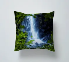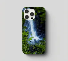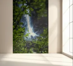 Vista attraverso cespugli, alberi e foglie su una cascata islandese.