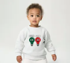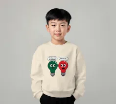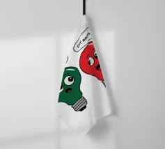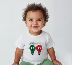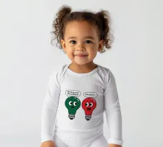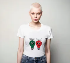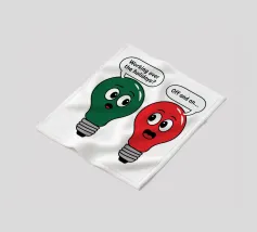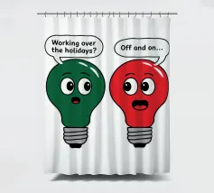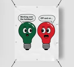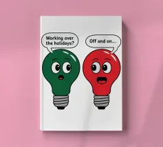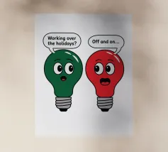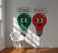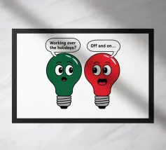Due lampadine dei cartoni animati, una verde e una rossa, si confrontano in una conversazione scherzosa sul lavoro durante le vacanze. La lampadina verde pone la domanda, mentre la lampadina rossa risponde con umorismo.