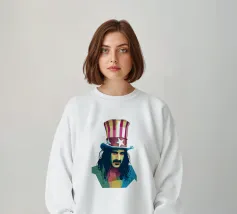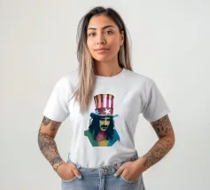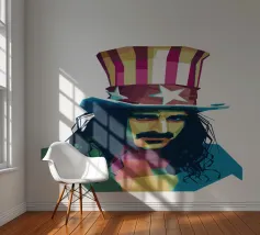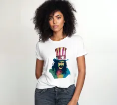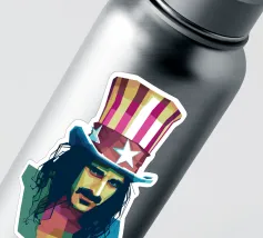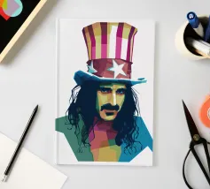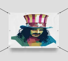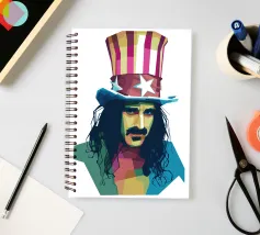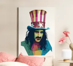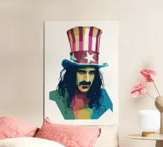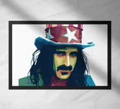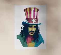 Zappa in stile WPAP è ritratto con forme geometriche audaci e colori vibranti e contrastanti, che catturano il suo spirito eccentrico e ribelle. I tratti distintivi del suo viso, come i folti baffi, la macchia dell'anima e lo sguardo intenso, sono trasformati in una composizione astratta di grande impatto. Le linee spigolose e le dinamiche transizioni di colore riflettono il suo approccio avanguardistico alla musica e la sua impavida creatività, incarnando l'essenza della sua arte anticonvenzionale.