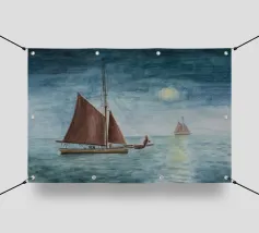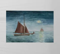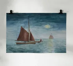 Barche Zeesen con vele rosse navigano sul Bodden al chiaro di luna.