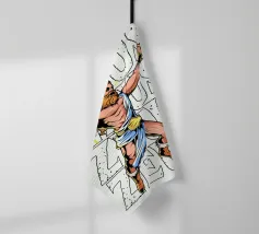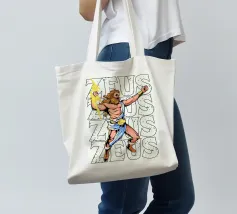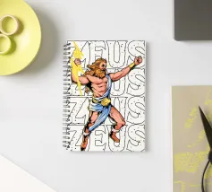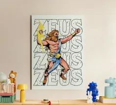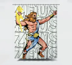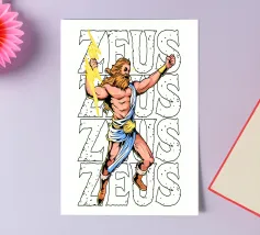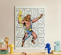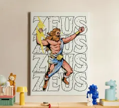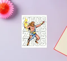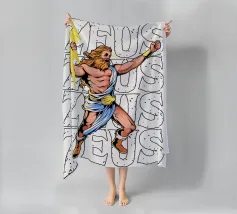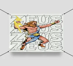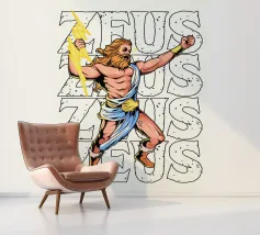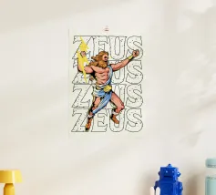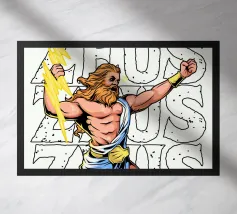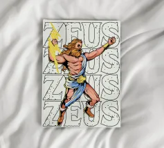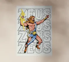 Zeus è raffigurato con le braccia alzate e due fulmini in mano. Il suo corpo muscoloso, i capelli fluenti e lo sguardo determinato incarnano il potere divino. L'iscrizione ripetuta "ZEUS" sullo sfondo conferisce ulteriore intensità alla raffigurazione.