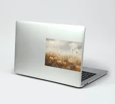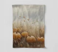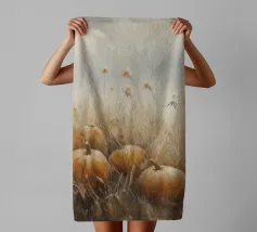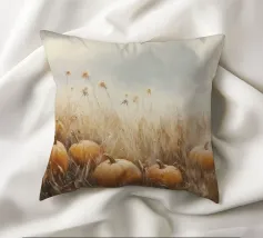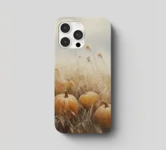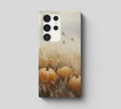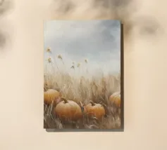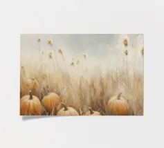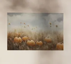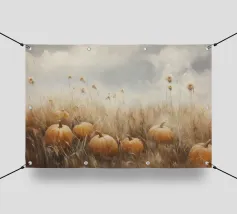 Zucche vivaci sparse in un campo erboso sotto un cielo nuvoloso, con alti fiori bianchi sullo sfondo. Cattura l'essenza dell'autunno.