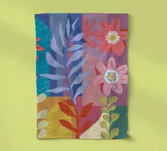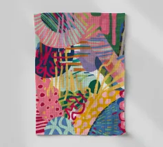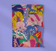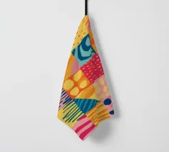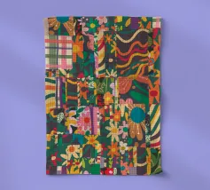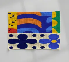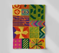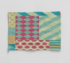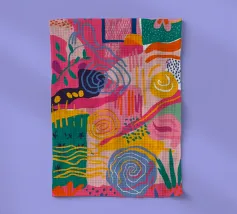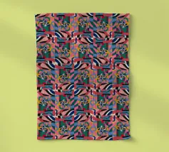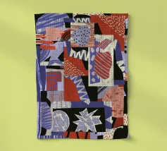 Un motivo astratto combina blocchi di colore simili a patchwork con energici scarabocchi e strisce, creando un design dinamico, giocoso e artistico.