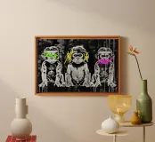 Questo trittico di street art provocatorio cita il famoso motivo delle "Tre Scimmie" con un tocco sovversivo. L'estetica dello stencil di Banksy incontra la ribellione punk al neon: la saggezza classica diventa critica mediatica contemporanea. Le barre fluorescenti simboleggiano la censura digitale in una società sotto sorveglianza. Il dramma monocromatico con accenti sgargianti crea un'atmosfera da galleria urbana. Una dichiarazione intelligente per tutti coloro che vedono l'arte come commento sociale. La ribellione incontra la filosofia. Mostrate il vostro interesse per i problemi sociali con quest'opera.