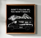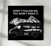 Avete un veicolo a trazione integrale, 4x4, 4WD - magari un camper, o meglio ancora uno Sprinter? Allora questo avviso ai vostri compagni di viaggio è molto importante: Non seguitemi, non ce la farete. Vi risparmia un sacco di lavoro durante il traino delle altre auto e controlla anche se gli altri hanno il senso dell'umorismo. Perché non vuole essere una cosa seria, ma piuttosto un po' divertente. Meglio se come maglietta in nero. Così avrete sempre con voi il disegno quando andate in fuoristrada. Divertitevi con esso.