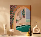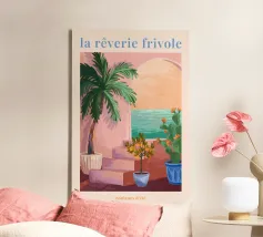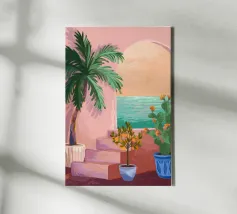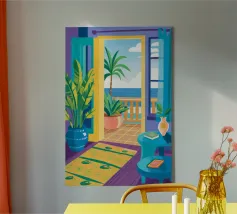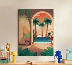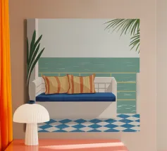 Un'illustrazione tropicale in un ambiente mediterraneo. La panchina invita a sognare in questo ambiente estivo.