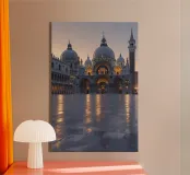 Nel cuore di Venezia, la Basilica di San Marco emana un'aura di splendore senza tempo. La piazza bagnata ingrandisce le sue cupole, i mosaici e gli archi, offrendo una vista che sembra quasi irreale. Immersa nella morbida luce dorata dell'alba, l'arte bizantina della basilica prende vita, raccontando storie di storia, fede e genialità artistica. Il delicato gioco di luci e riflessi trasforma la scena in un ritratto ipnotico della maestria architettonica europea.