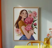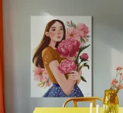 Il dipinto mostra una persona che tiene in mano un bouquet di grandi fiori rosa. Lo sfondo è pieno di altri elementi floreali, che sottolineano la bellezza e l'abbraccio della natura.