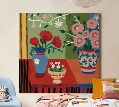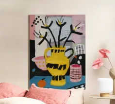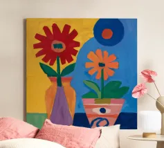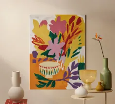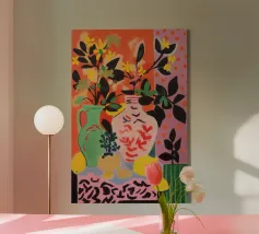 A bold and graphic abstract floral piece. Stylized flowers and leaves in a bowl are depicted with strong outlines and flat areas of color, creating a dynamic, modern, and highly decorative work of art.