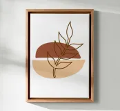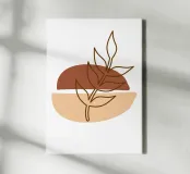 Una composizione astratta presenta un semplice sfondo geometrico marrone e beige con un delicato disegno al tratto di un ramoscello frondoso. Il design minimalista enfatizza gli elementi naturali in un equilibrio armonioso.