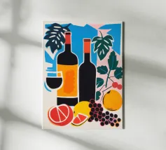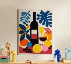 Una rappresentazione audace e astratta di elementi essenziali della cucina come le bottiglie di olio e aceto, resa in uno stile grafico e decostruito con colori primari.