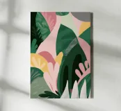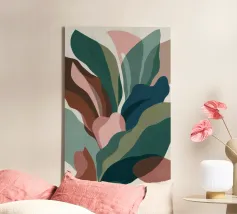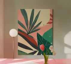Un'elegante opera d'arte astratta presenta foglie sovrapposte e forme organiche in una sofisticata tavolozza di verde, rosa e bianco, creando una composizione botanica moderna e graziosa.
