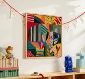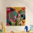 Una composizione astratta vibrante e dinamica, caratterizzata da un mix di forme di foglie colorate, motivi audaci come strisce e punti, e forme energiche. L'opera è una celebrazione moderna, gioiosa e artistica del colore e del design.