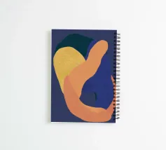 Una composizione astratta di forme sovrapposte e arrotondate in giallo, arancione e blu intenso, che suggerisce una forma umana reclinata in uno stile minimalista e fluido, che esplora l'essenza della forma e del colore.
