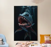 Questa rappresentazione iperrealistica di un predatore delle profondità marine mette in mostra i suoi denti affilati e la sua bocca cavernosa, pronta a colpire nell'eterna oscurità delle profondità oceaniche. I riflessi luminosi nei suoi giganteschi occhi neri aggiungono un tocco inquietante, alludendo a un cacciatore di vertice costruito per sopravvivere negli abissi. I raggi d'acqua illuminati dall'alto creano un contrasto inquietante con il suo corpo blu scuro, quasi metallico. Questa opera d'arte digitale cattura perfettamente il terrore e la bellezza dei più temibili abitanti dell'oceano.