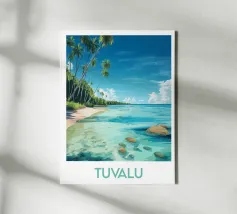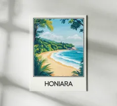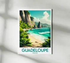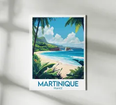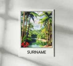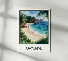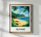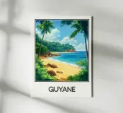 Poster decorativo che illustra una spiaggia paradisiaca della Guyana francese, con sabbia dorata, palme rigogliose e acque cristalline. Una perfetta evocazione della serenità tropicale, ideale per aggiungere un tocco esotico e rilassante alla vostra casa.