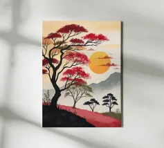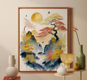 Sole dorato, montagne stratificate e alberi dalle vibranti tonalità autunnali.