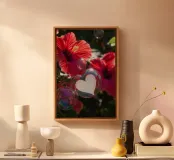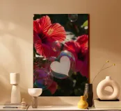Cuore romantico con fiori di ibisco rossi - Questa vibrante opera d'arte presenta un cuore scintillante in una bolla trasparente, che fluttua tra fiori di ibisco rosso brillante in piena fioritura. Le foglie verdi e i petali rosso intenso creano un contrasto sorprendente, mentre la luce del sole si riflette magnificamente sulla bolla, aggiungendo un'atmosfera sognante e stravagante. Questo quadro è ideale per aggiungere un tocco di romanticismo e di eleganza ispirata alla natura a qualsiasi ambiente.
