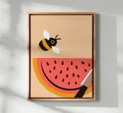 Un fresco mix di anguria succosa e api indaffarate! Questo disegno mostra la bellezza di una succosa anguria e delle api che le ronzano intorno.