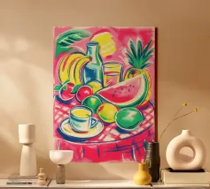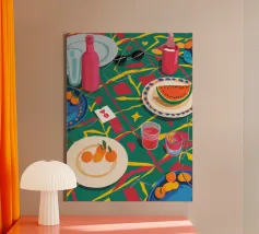 Una natura morta con una fetta di anguria, una tazza di succo di frutta e una pila di libri su una tovaglia colorata e a fantasia. La composizione è una rappresentazione fresca, intellettuale ed elegante della lettura e dei piaceri estivi.