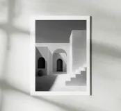 Poster in bianco e nero di architettura minimalista: archi, porte e scale immerse nella luce. Una texture a stucco, linee pure e un gioco di ombre grafiche creano un'atmosfera mediterranea di calma, design e Zen. Perfetto per un soggiorno, una camera da letto o un corridoio, questo elegante poster aggiunge profondità, modernità e raffinatezza alle pareti e si abbina perfettamente a un arredamento contemporaneo scandi o giapponese.