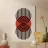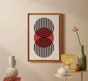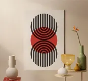 Un audace disegno astratto ispirato al Bauhaus, caratterizzato da cerchi rossi sovrapposti e ritmiche linee verticali nere. Un elemento d'arredo moderno e di grande impatto, perfetto per gli interni contemporanei.