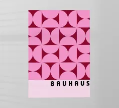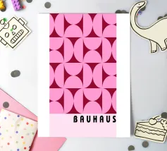 Accattivante stampa geometrica in stile Bauhaus con forme astratte ripetute formate da elementi curvi in tonalità contrastanti di rosa e magenta. Le linee pulite e la ripetizione creano un'estetica moderna e minimalista. File artistico digitale di alta qualità (7000x5000px, 300 dpi) perfetto per stampe di grande effetto. Ideale per una moderna decorazione murale rosa.