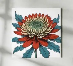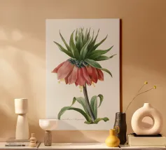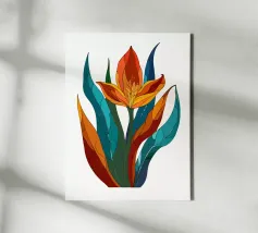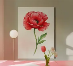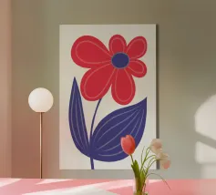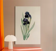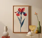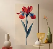 Un'illustrazione splendidamente dettagliata di un fiore di iris rosso e blu su uno sfondo chiaro, che mostra petali vibranti e sfumature morbide e naturali. Il grazioso stelo e le foglie ne esaltano il fascino artistico.