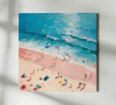 Quest'opera d'arte presenta un'avvincente veduta aerea di un litorale roccioso dove le acque turchesi cristalline sfumano nel blu profondo dell'oceano. Le pennellate espressive e stratificate conferiscono al mare una consistenza viva, mentre le rocce chiare e lo stretto sentiero costiero creano struttura e contrasto. Piccole figure umane enfatizzano la scala e invitano a una tranquilla riflessione al confine tra terra e acqua. In equilibrio tra astrazione e realismo, la composizione esplora la profondità, il movimento e l'immobilità, rendendola un pezzo raffinato per interni contemporanei e stampe d'arte di grande formato.