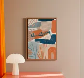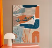 A modern abstract composition featuring terracotta colored arches, textured blue shapes, and organic lines. The artwork blends bohemian aesthetics with minimalist and abstract elements for a trendy, balanced piece.