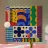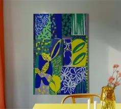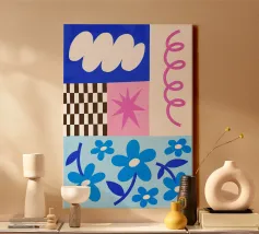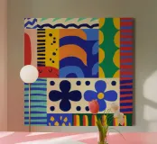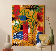 Una composizione astratta audace e dinamica con fiori stilizzati, motivi geometrici e forme organiche in una vibrante tavolozza di colori primari. L'opera d'arte ha un'atmosfera giocosa e folkloristica con un tocco moderno.