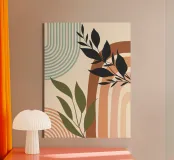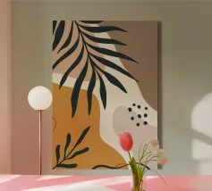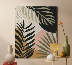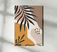 Foglie stilizzate in nero e verde si stagliano su uno sfondo di strisce curve e fluide in morbide tonalità di terra. Il disegno combina elementi botanici con forme geometriche astratte per un look moderno.