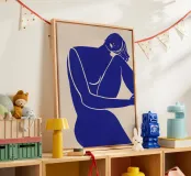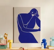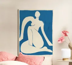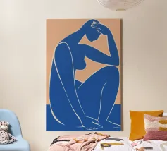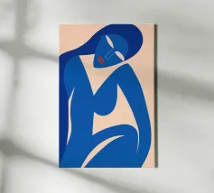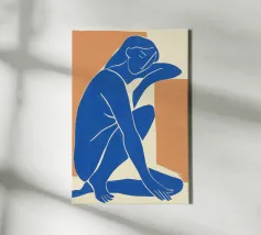 La silhouette blu di una figura umana si staglia su uno sfondo color crema, in una posa contemplativa con un braccio appoggiato sul corpo e l'altro dietro la testa. Lo stile minimalista trasmette emozioni attraverso linee semplici e colori solidi, garantendo un forte impatto visivo.