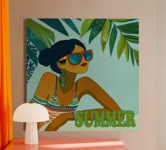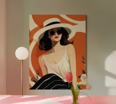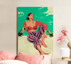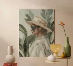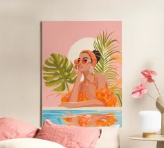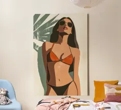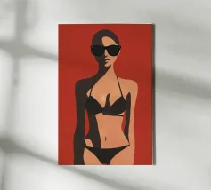 Un ritratto audace e solare che trasmette il fascino dell'estate vintage. Questo dipinto digitale presenta una donna sicura di sé in bikini rosso, accovacciata con grazia su uno sfondo di foglie tropicali sovradimensionate e fogliame dorato. Gli occhiali da sole a occhi di gatto e il vivace foulard strizzano l'occhio alla moda rétro, mentre i tratti pittorici sciolti e la tavolozza calda creano un'energia dinamica ed espressiva. Una celebrazione della femminilità, del calore e dello stile senza tempo: questo pezzo irradia vibrazioni vacanziere, ritmo tropicale e spensierata sicurezza di sé.