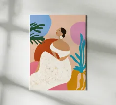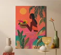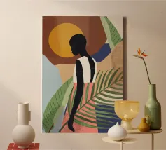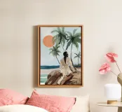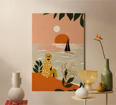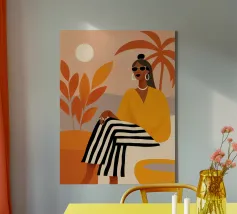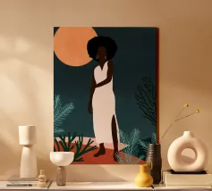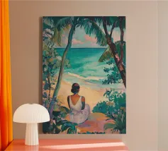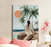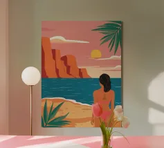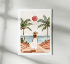 Grazioso dipinto digitale di una donna sicura di sé in una fluente vestaglia bianca seduta su una spiaggia rocciosa con palme e un vibrante sole arancione. Questa elegante e serena scena costiera evoca lusso, calma e vibrazioni tropicali. Perfetto per gli amanti della moda, dell'arte moderna e dell'arredamento tropicale. Aggiunge raffinatezza e calore a soggiorni, camere da letto e uffici. Regalo ideale per i collezionisti d'arte e gli appassionati di ritratti contemporanei ispirati alla spiaggia.