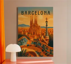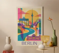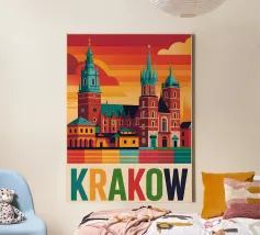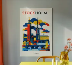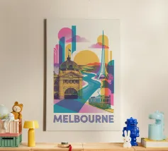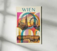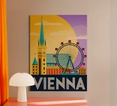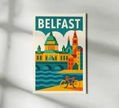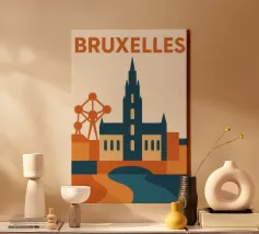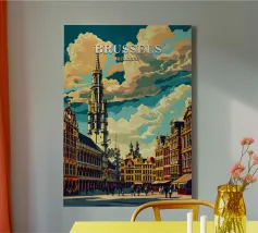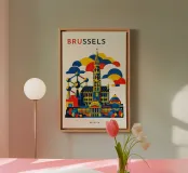 A bold, graphic celebration of Brussels, rendered through clean geometry and confident colour blocking. Iconic civic architecture rises at the centre of the composition, framed by layered clouds and simplified urban forms that give the scene rhythm, balance, and visual clarity. The strong silhouettes and playful contrasts capture the city’s character without relying on intricate detail.