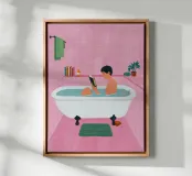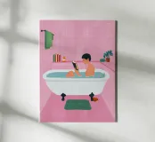 Vista dall'alto di una persona che si rilassa in un bagno di schiuma, leggendo un libro. La scena in un bagno piastrellato di rosa è una rappresentazione perfetta della cura di sé, della tranquillità e della fuga pacifica.