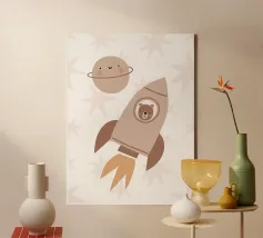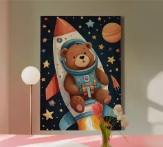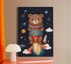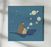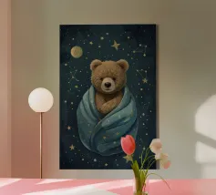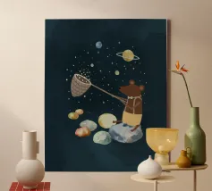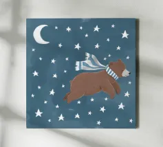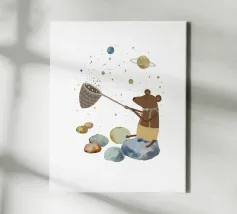 Un'illustrazione giocosa di due orsi che soffiano bolle nello spazio che aggiunge divertimento e meraviglia a qualsiasi arredamento o abbigliamento. Perfetto per i sognatori di tutte le età.